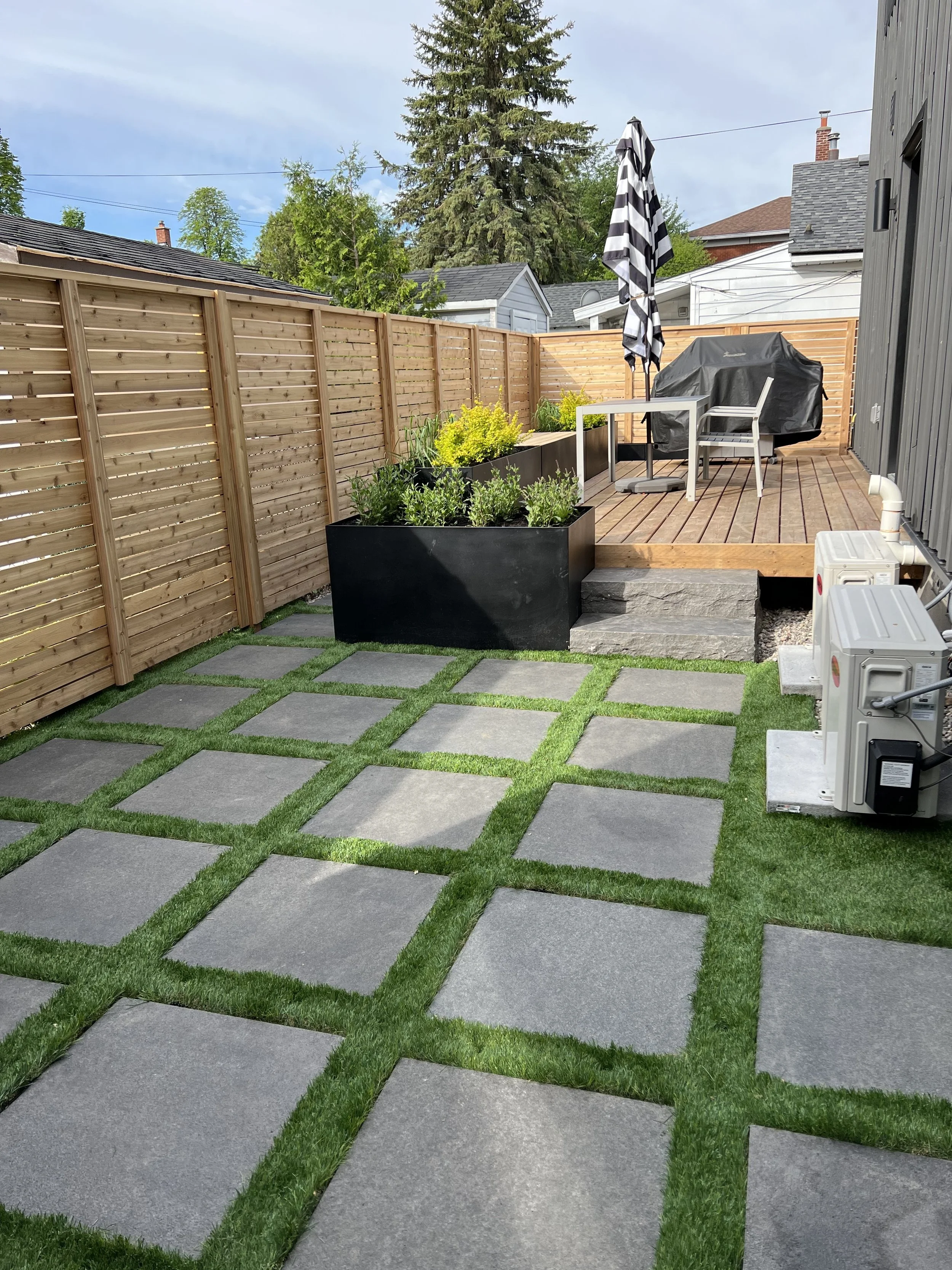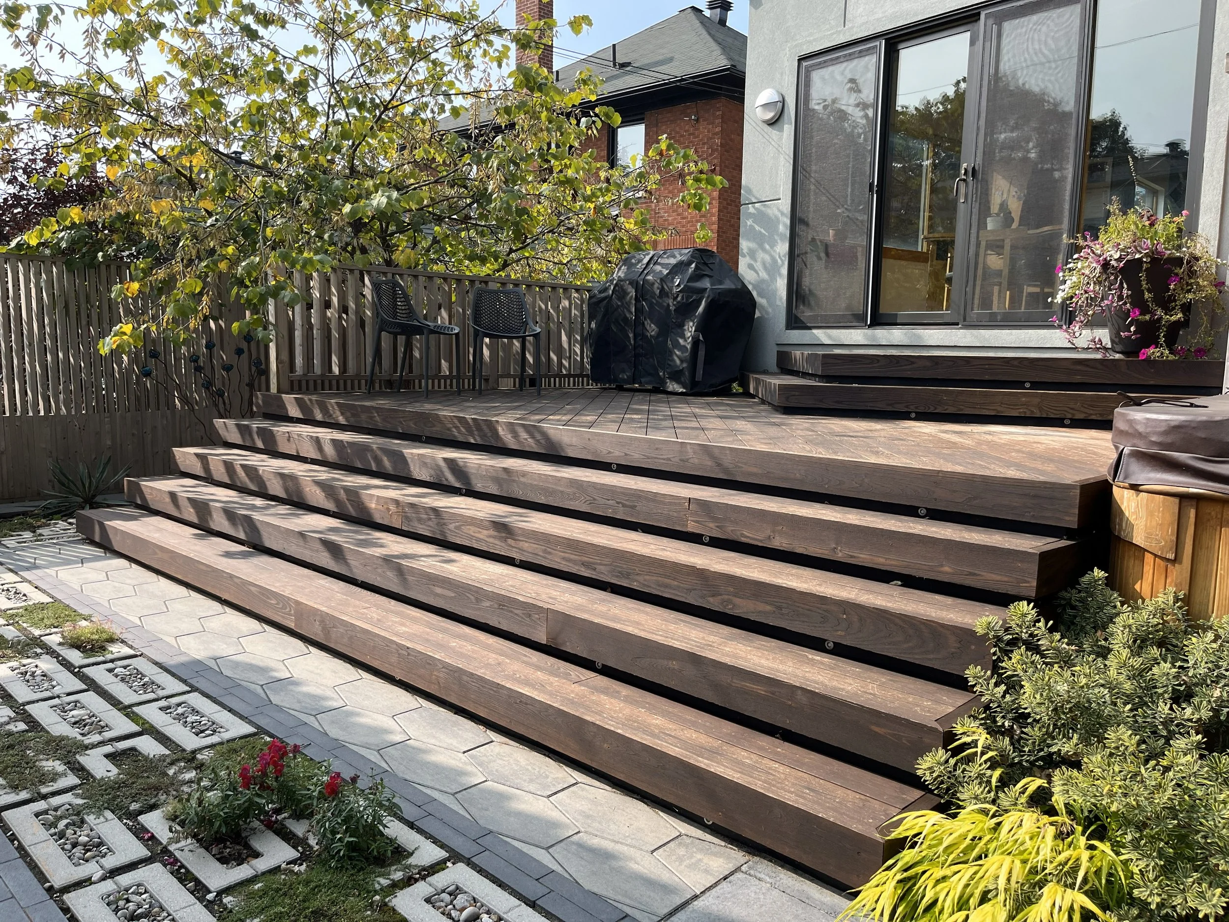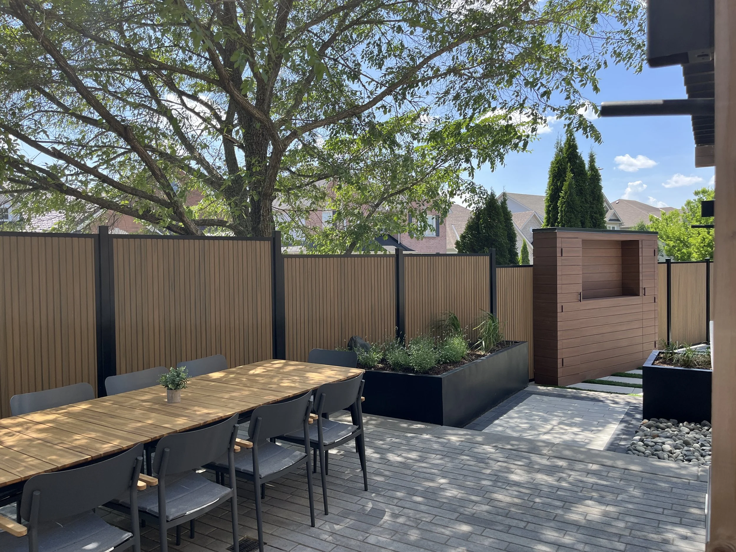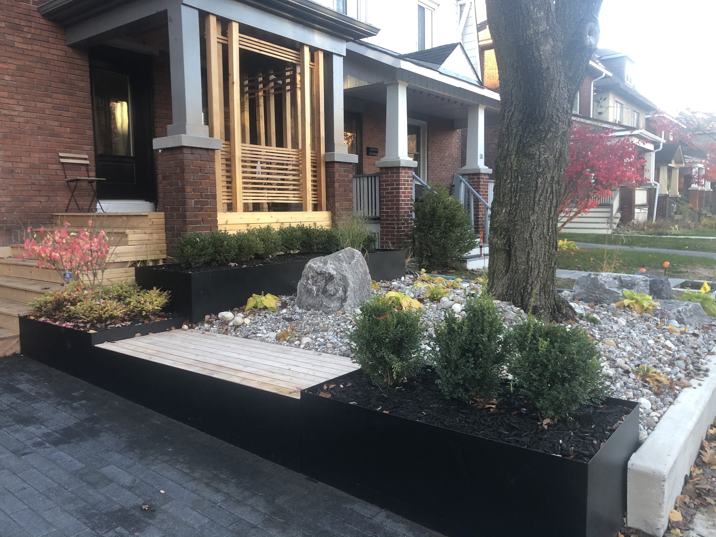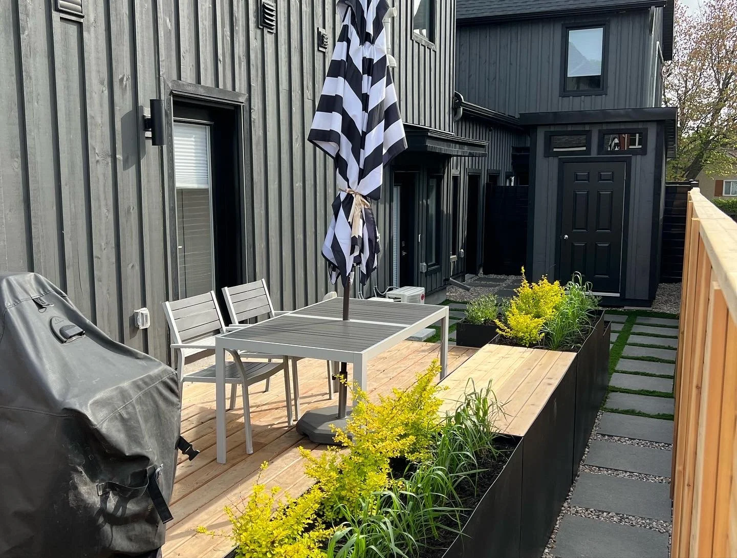 Thermory decking with integrated planter, lighting, and black metal inset