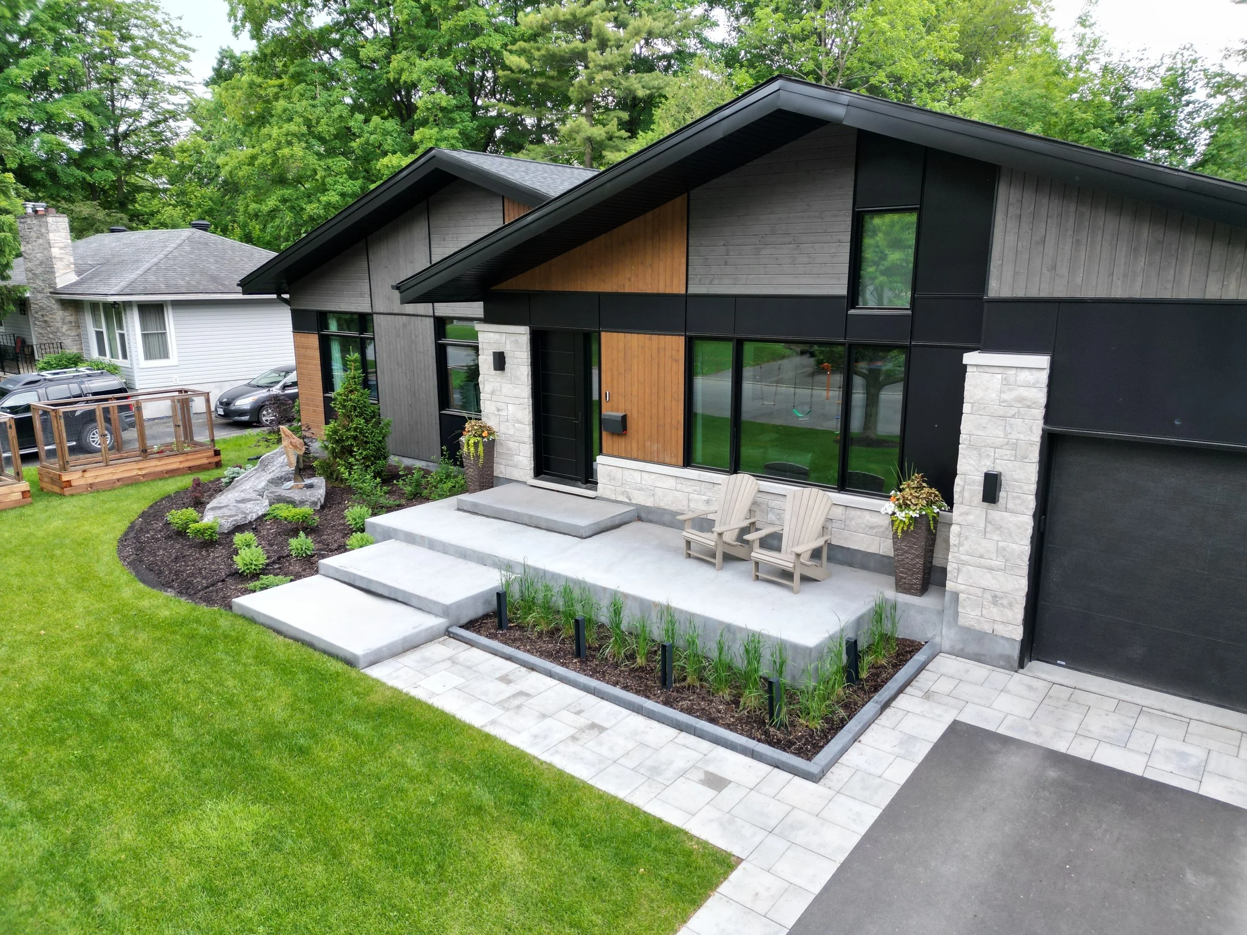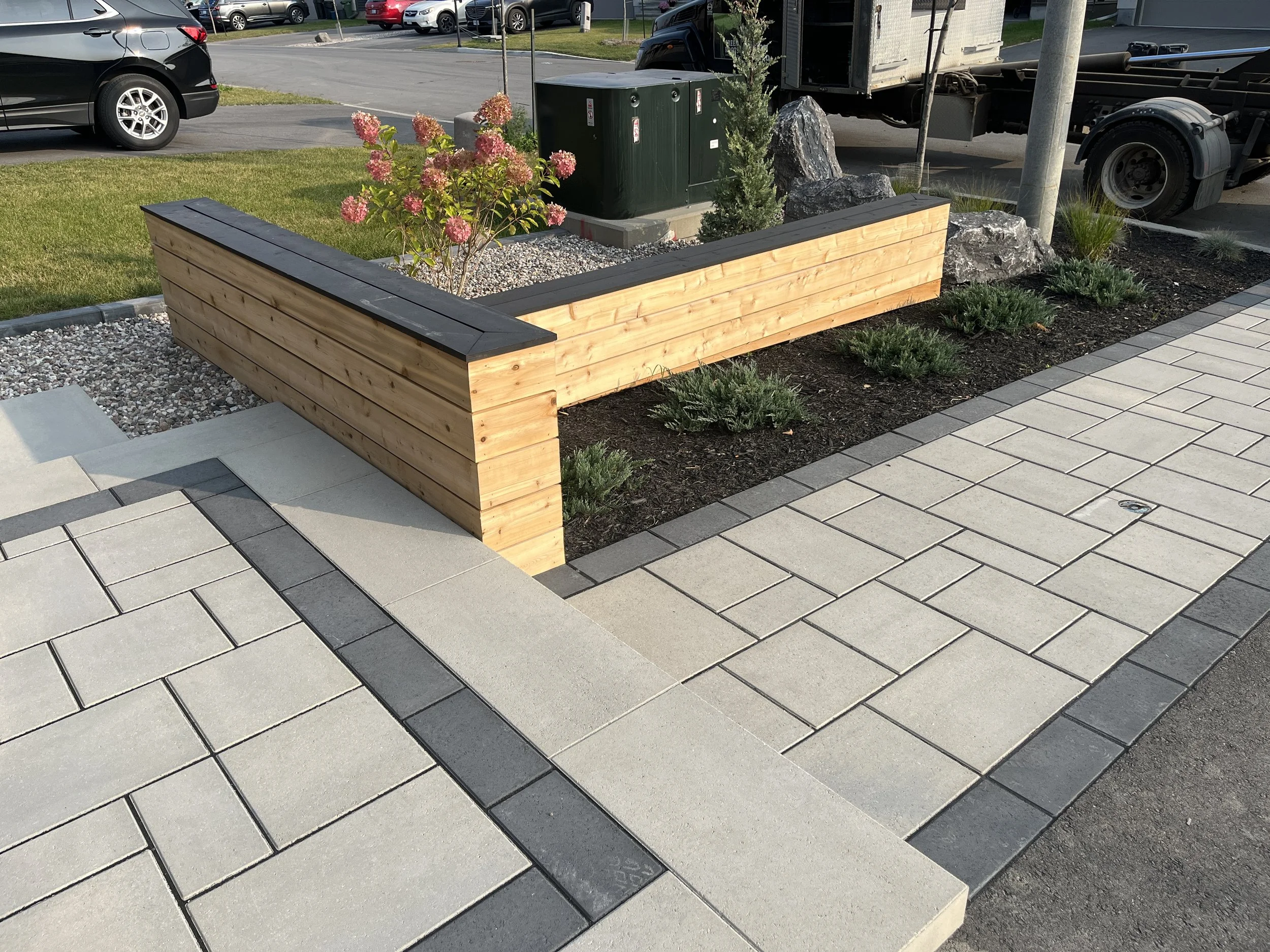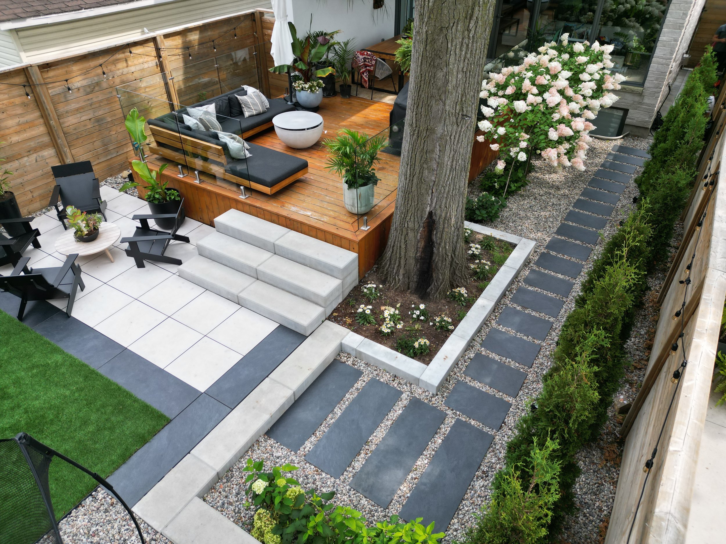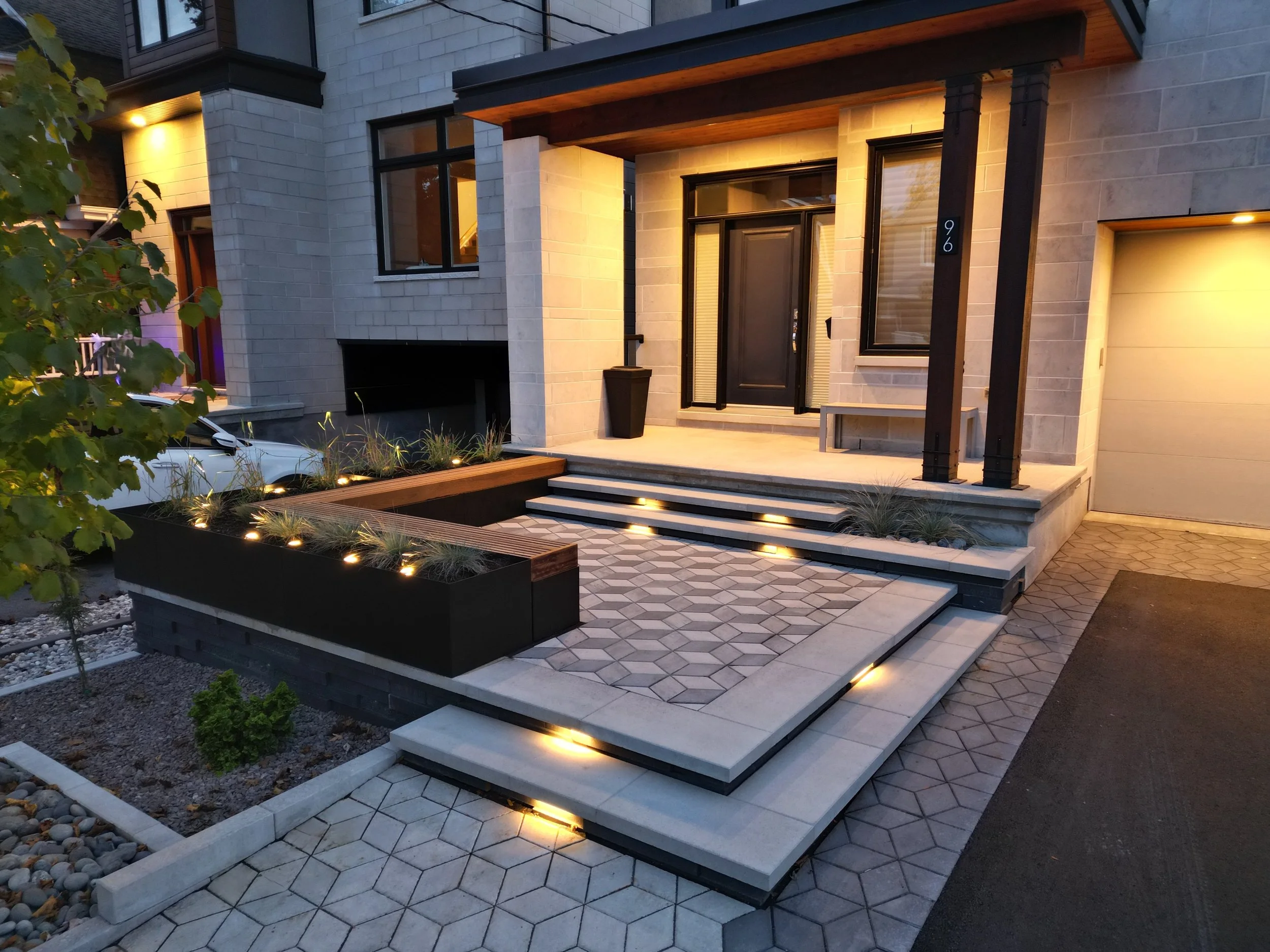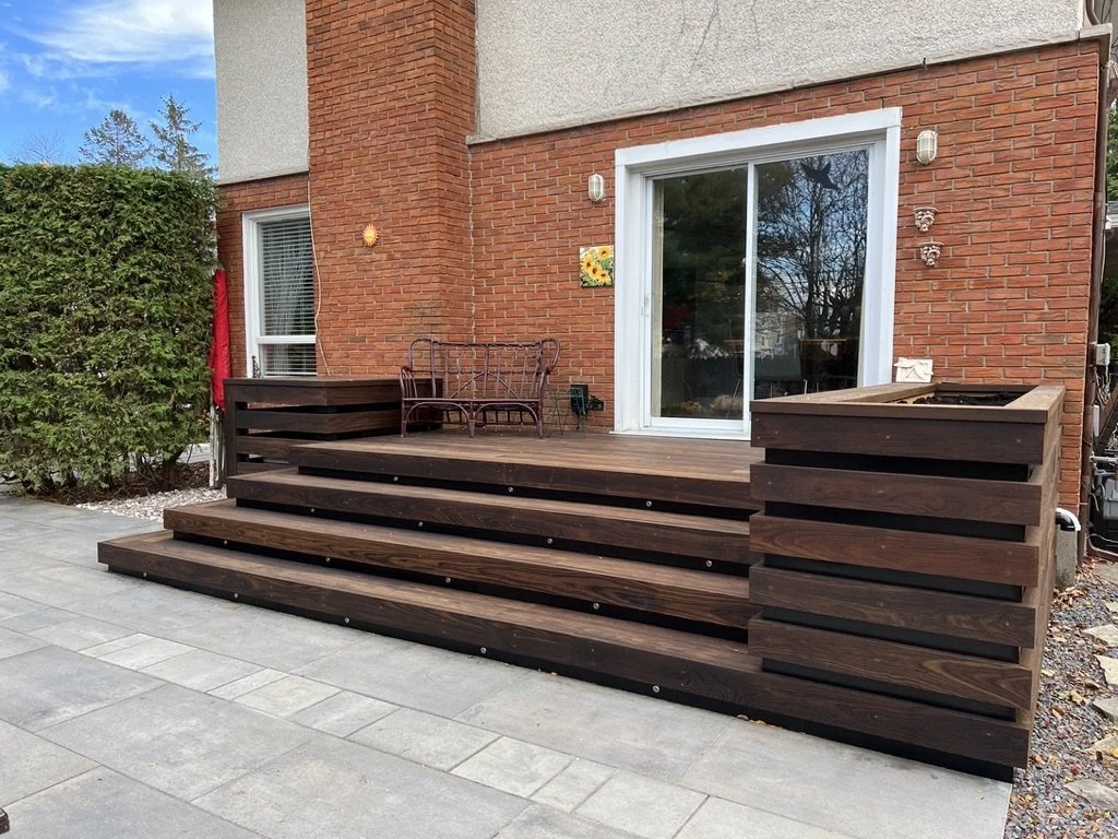 Thermory decking with integrated planter, lighting, and black metal inset