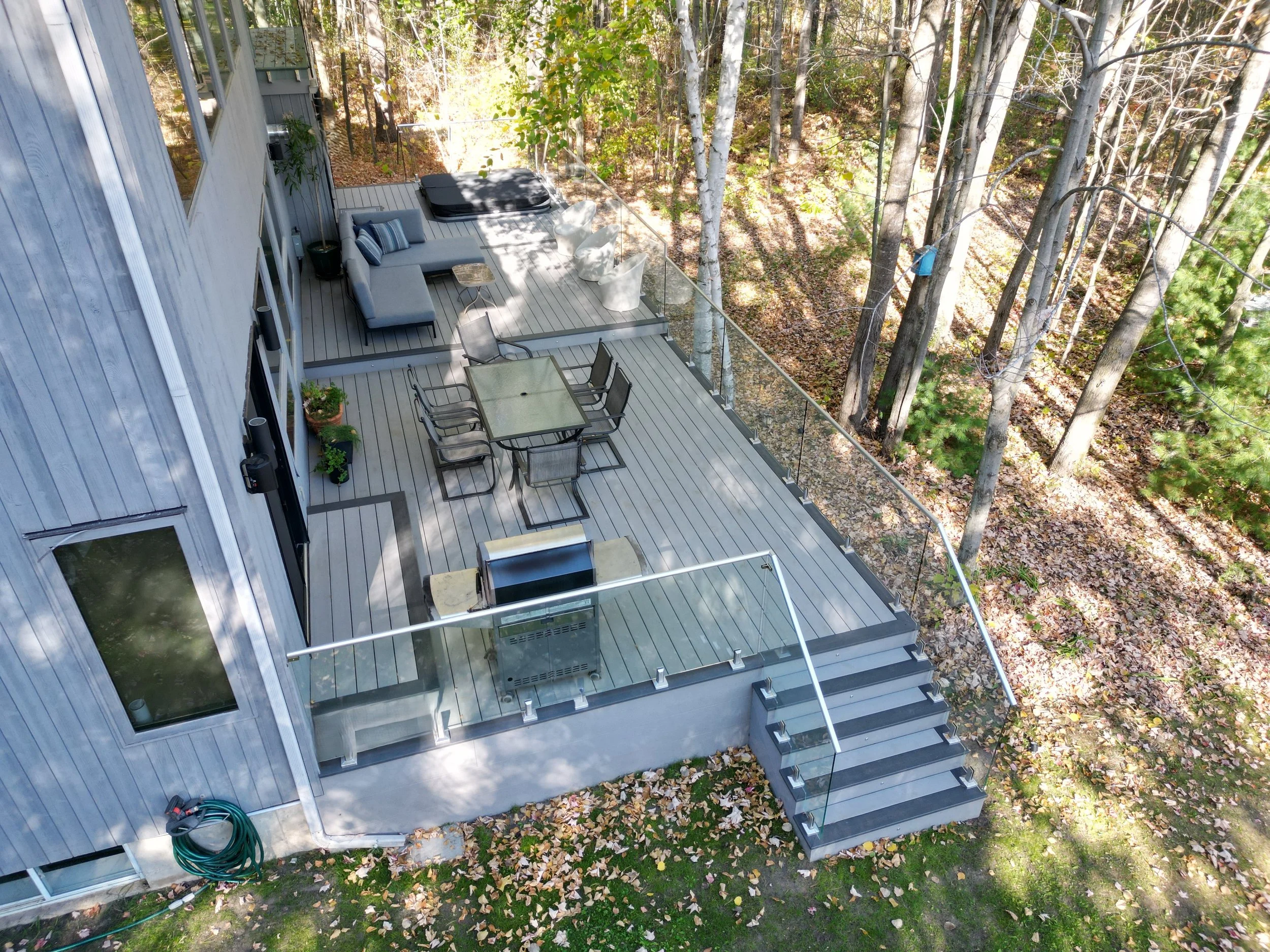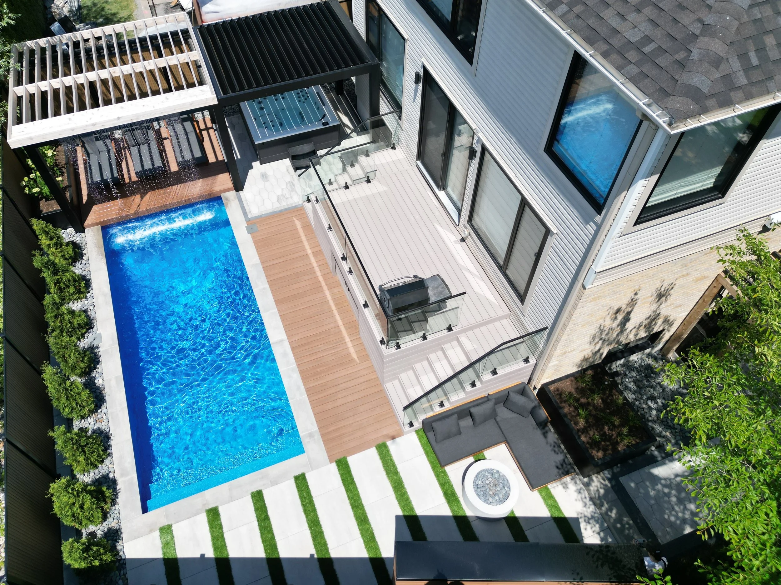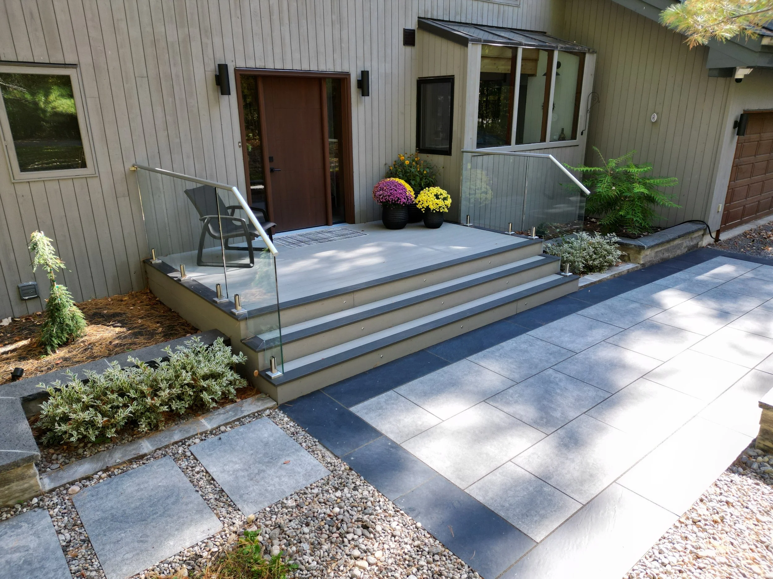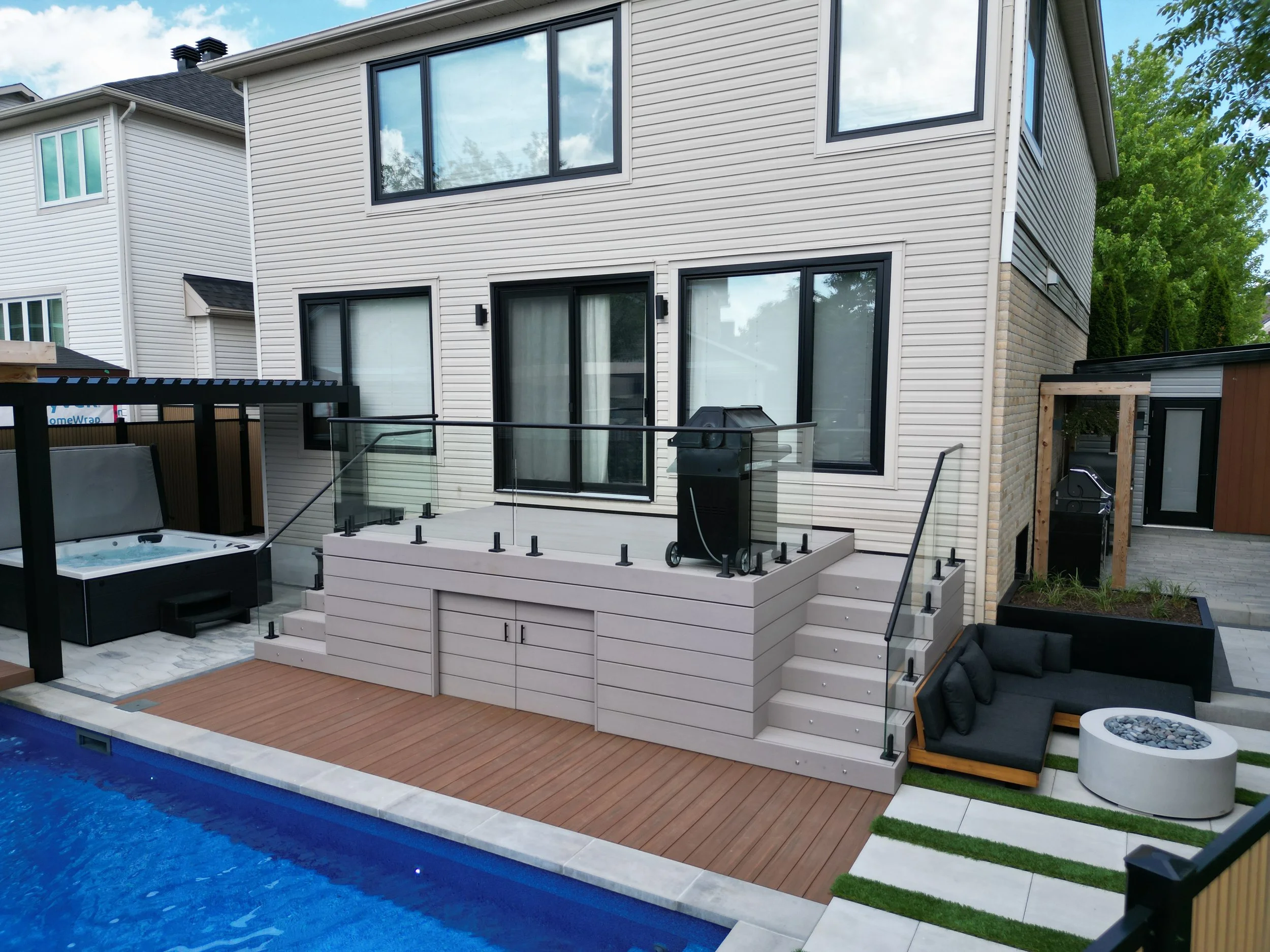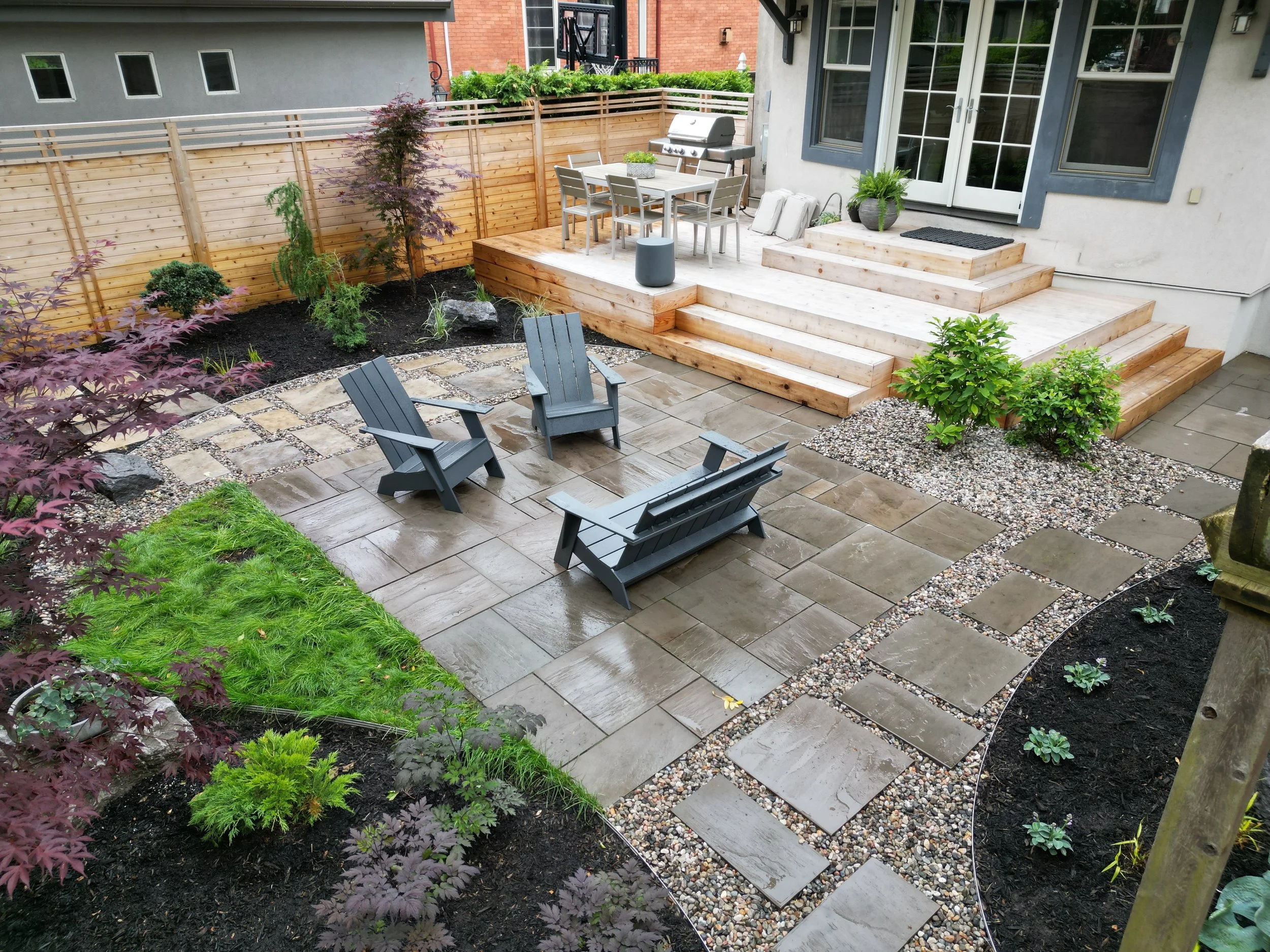 Thermory decking with integrated planter, lighting, and black metal inset