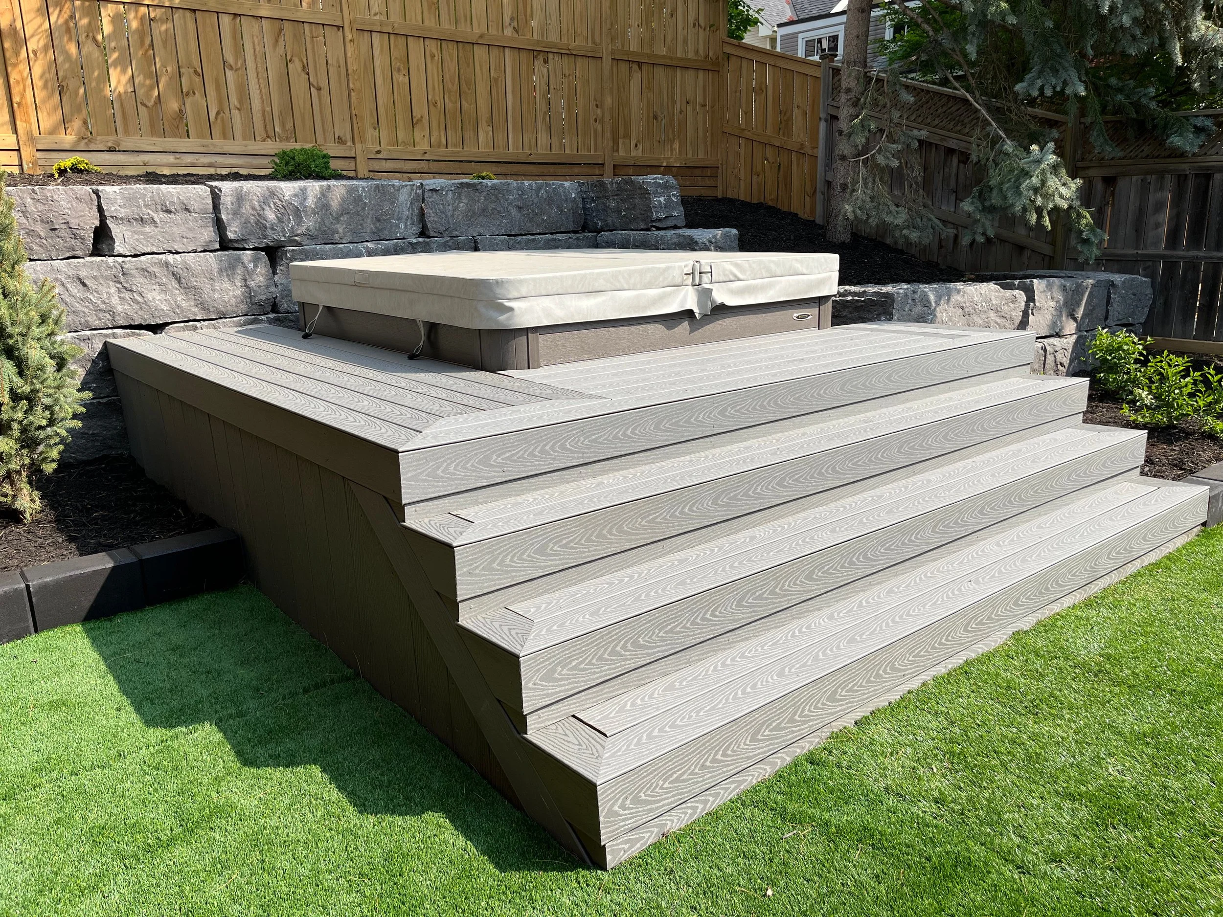 Two tone composite decking with sunken hot tub and lighting
