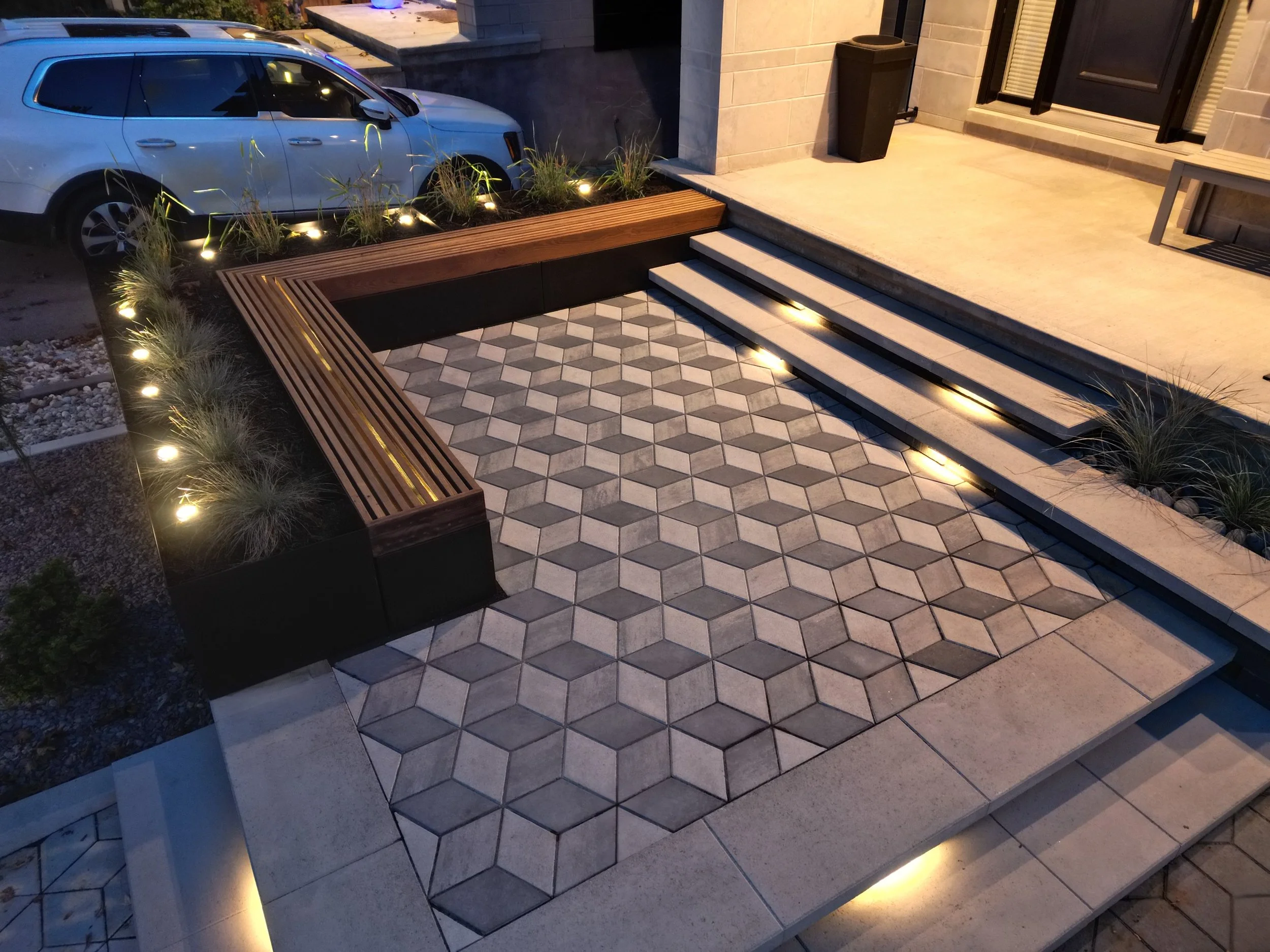 Custom tiered decking with integrated planter and lighting