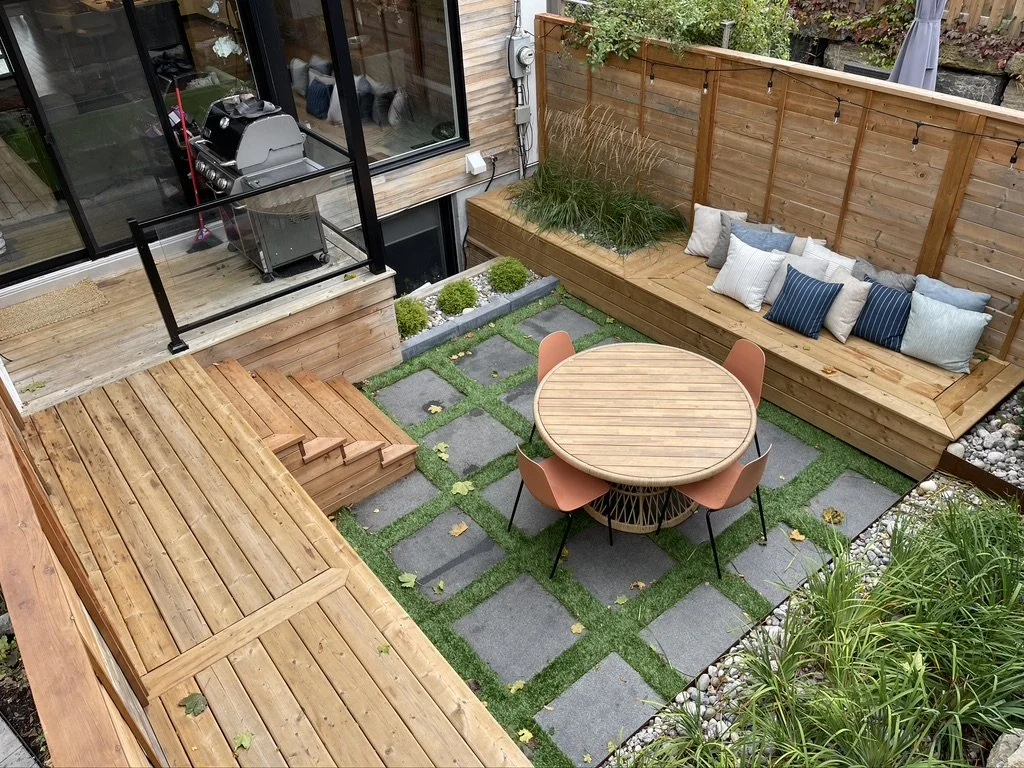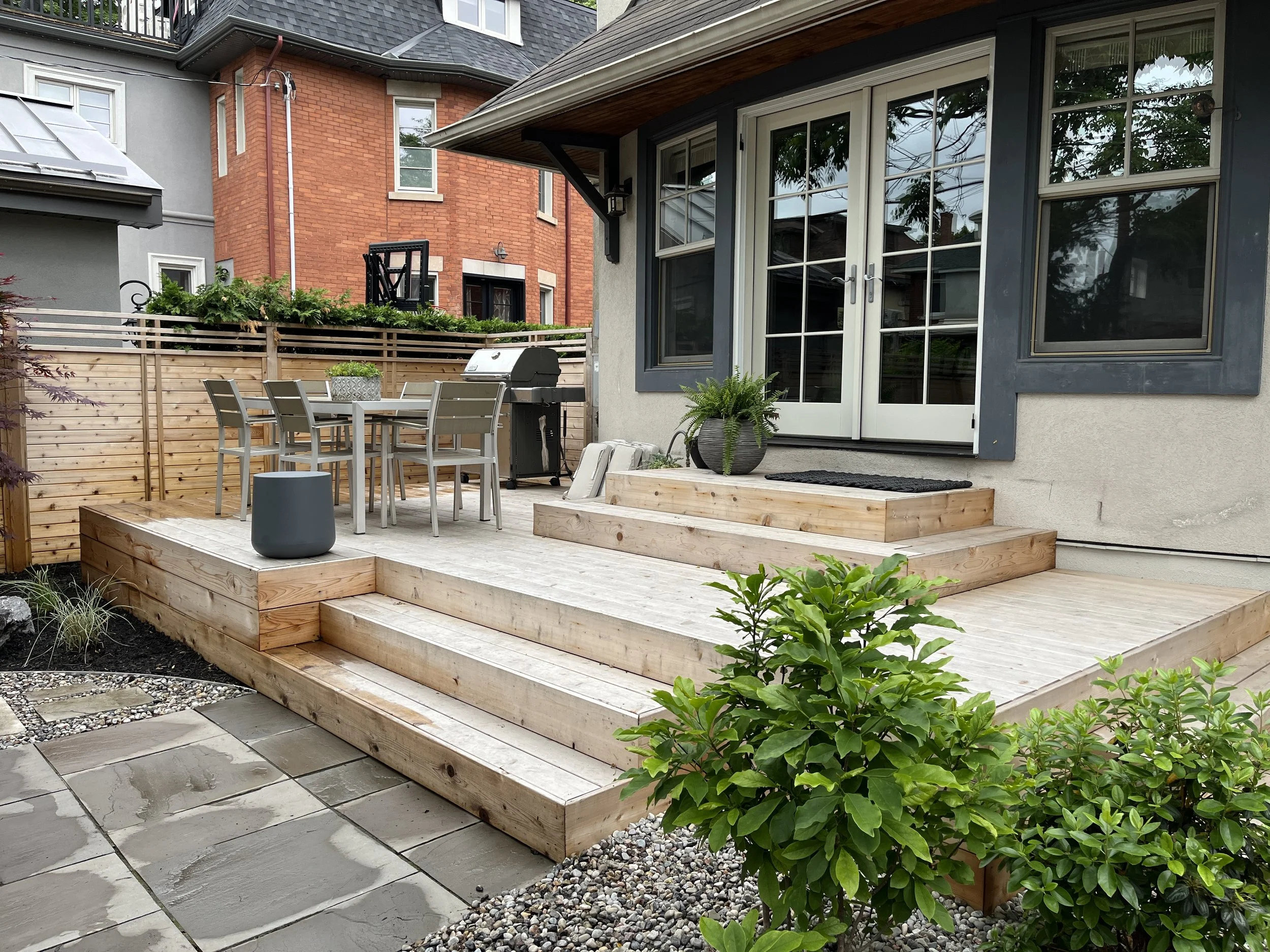 Tiered cedar decking with integrated planters and deck seating