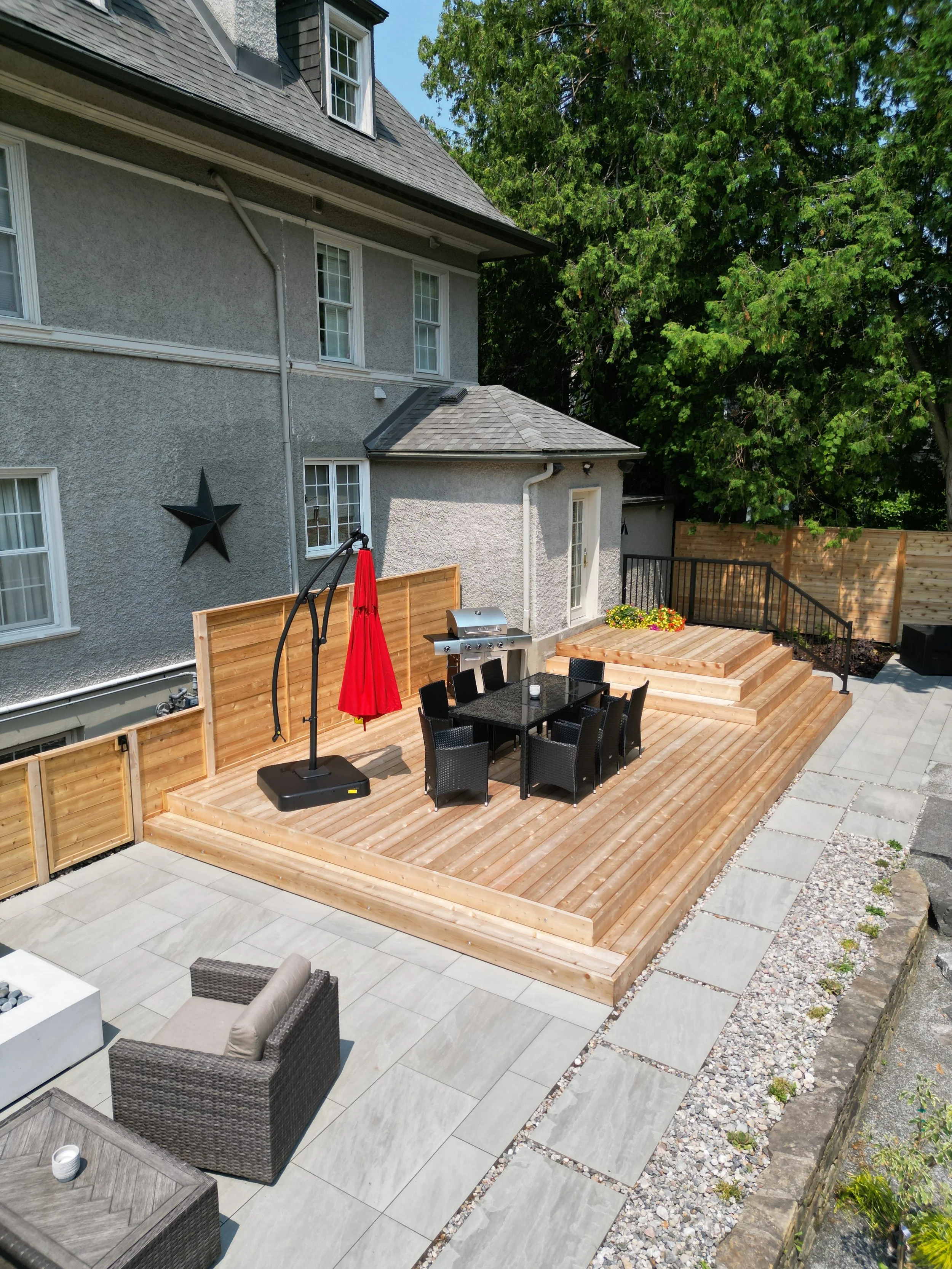 Tiered cedar deck with integrated planters