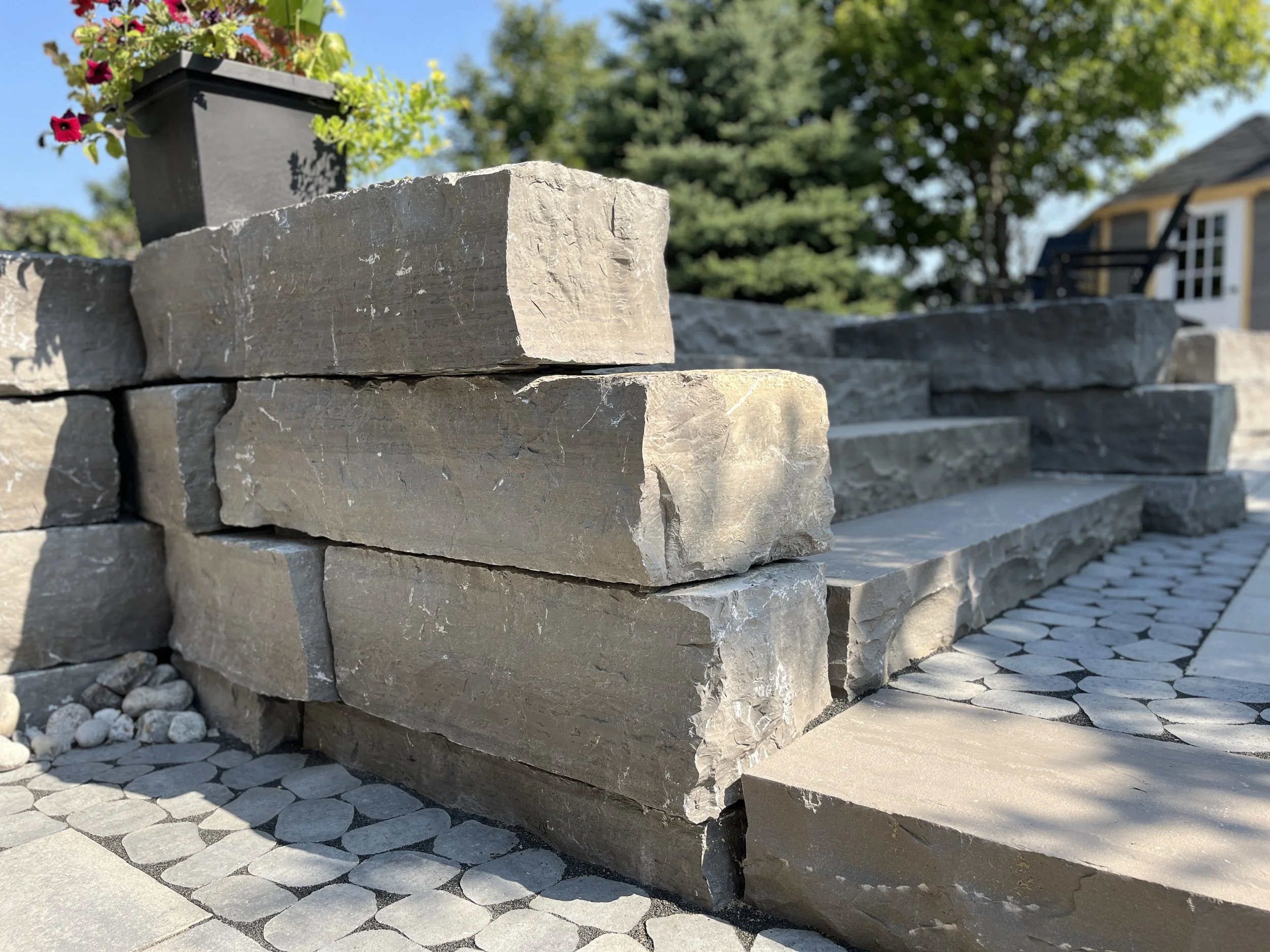 Stepped armor stone wall for raised patio